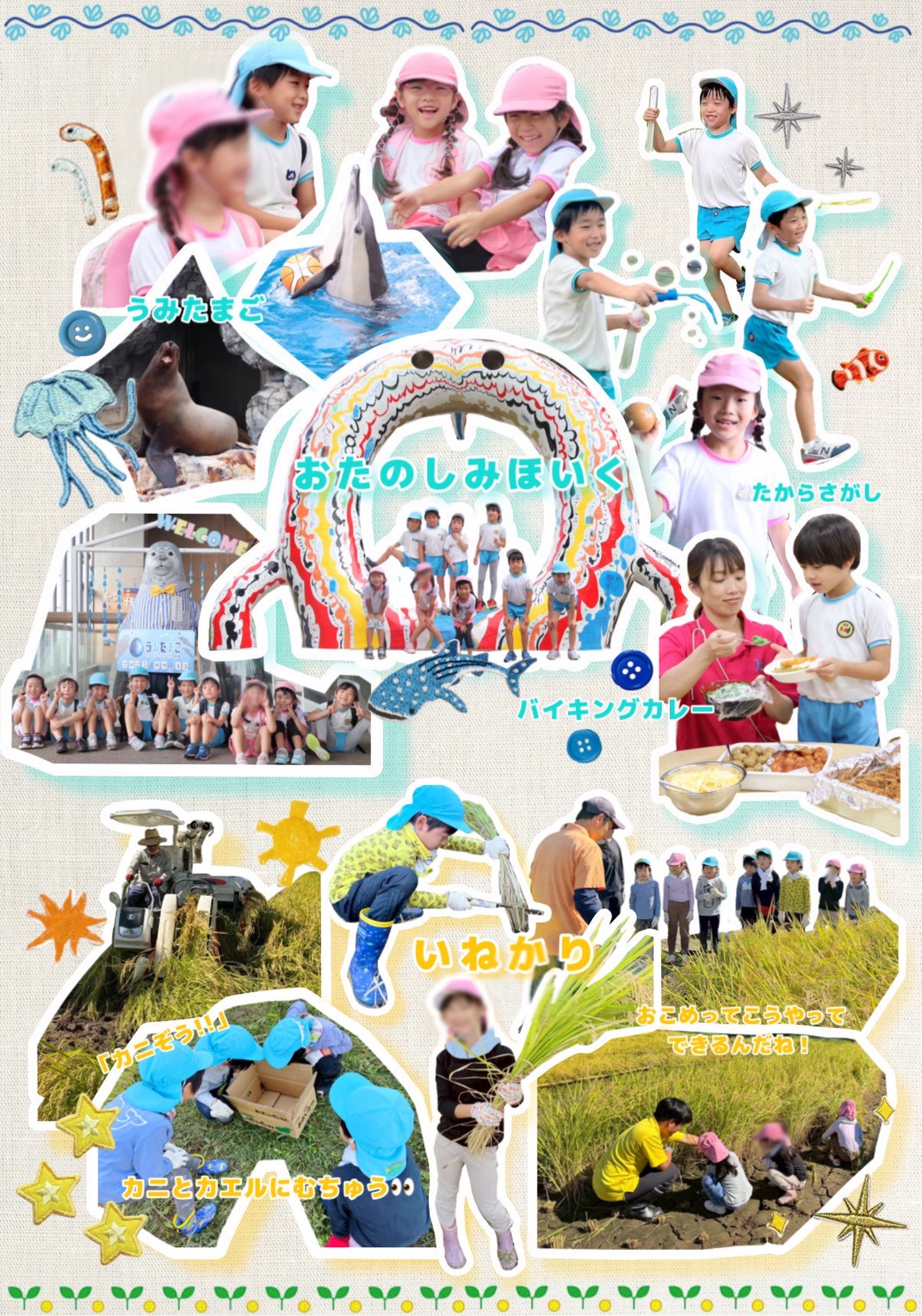 おたのしみ保育ではうみたまごに行ったり、宝さがしをしたり、バイキングカレーでみんなで食べたりと楽しい体験が出来てとても素敵な思い出となりました✨️また、稲刈り体験では、みんなが食べているごはんとなるお米がどうやって出来るのかを学ぶことが出来ました✨️
